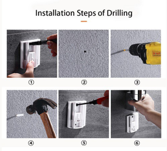 2.Drill holes in the position you’ve marked, then tap the plastic bolt holder into the wall.