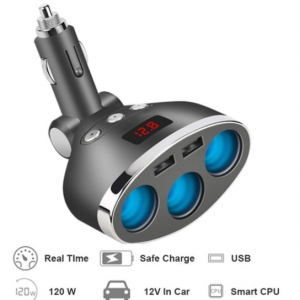 NEW DC 12/24V 1 TO 3 SOCKETS CAR CIGARETTE LIGHTER SOCKET SPLITTER HUB DUAL USB CAR CHARGER POWER ADAPTER WITH ON/OFF SWITCH AND VOLTAGE DISPLAY FAST CHARGING FOR CELL PHONE